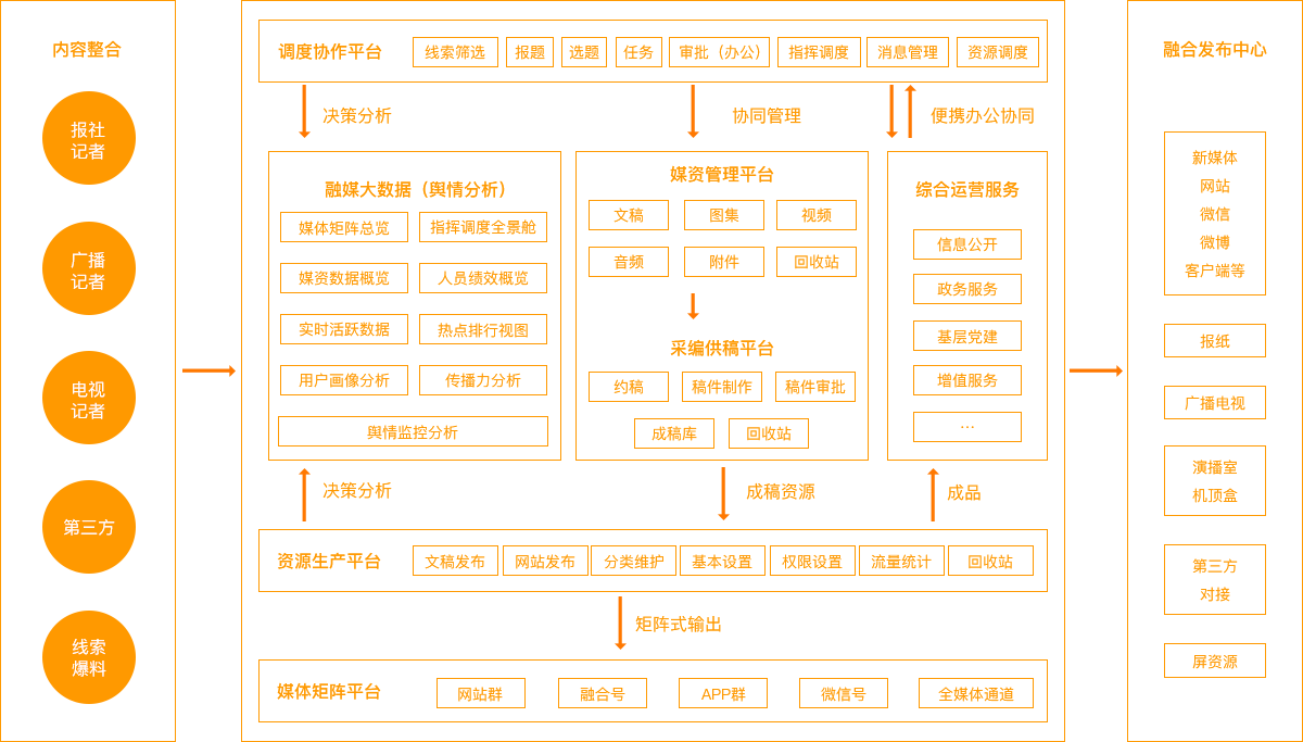 指揮調(diào)度協(xié)作、全媒體矩陣、全媒體媒資、采編供稿、全媒體資源生產(chǎn)、融媒大數(shù)據(jù)、輿情分析、綜合服務(wù)。